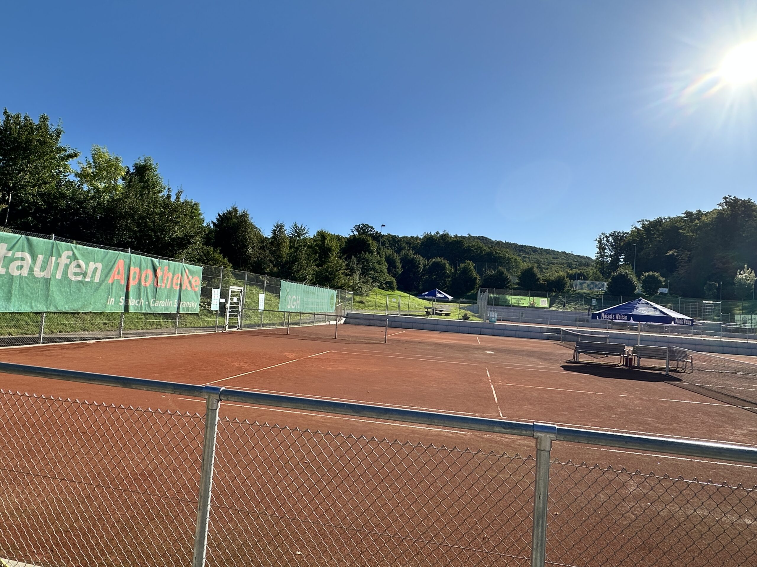 Unsere Anlage liegt idyllisch am Rande von Salach, mit Blick in den Wald Richtung Staufeneck. Wer uns besucht, spürt sofort die besondere Atmosphäre: Während auf den Plätzen die Bälle über das Netz fliegen, hört man Lachen von der Terrasse, Kinder rennen nach dem Training über die Anlage – und mittendrin fühlt man sich einfach willkommen. Nach der kompletten Sanierung im Jahr 2022 präsentieren sich unsere Plätze und das Vereinsgelände in modernem Glanz. Ob spannende Punktspiele, lockere Trainingsstunden oder einfach ein paar Bälle mit Freunden – unsere Anlage bietet perfekte Bedingungen. Entlang der Plätze laden viele gemütliche Sitzmöglichkeiten dazu ein, Spiele entspannt zu verfolgen und die Atmosphäre zu genießen.
